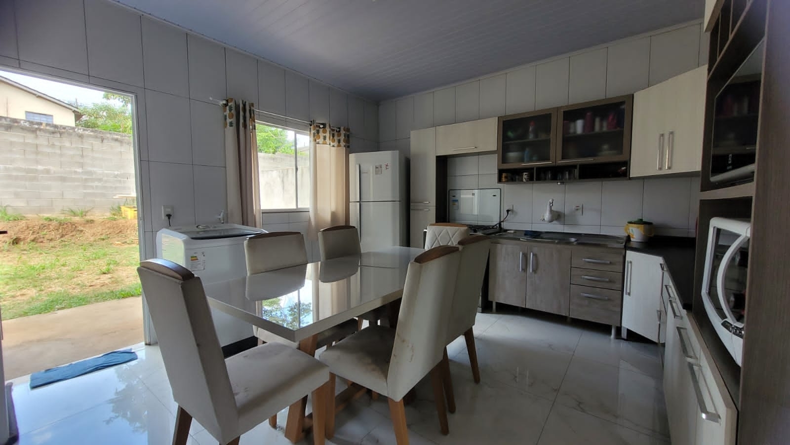 73m² - 2 quartos, sala e cozinha separadas, banheiro, área de serviço e garagem coberta.