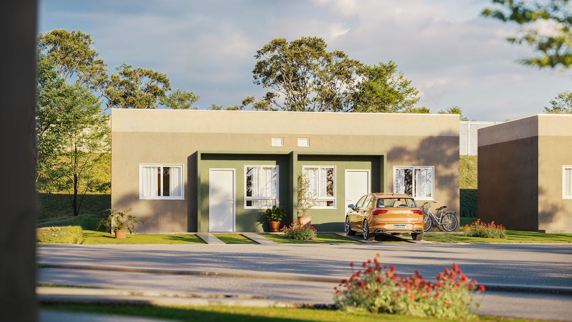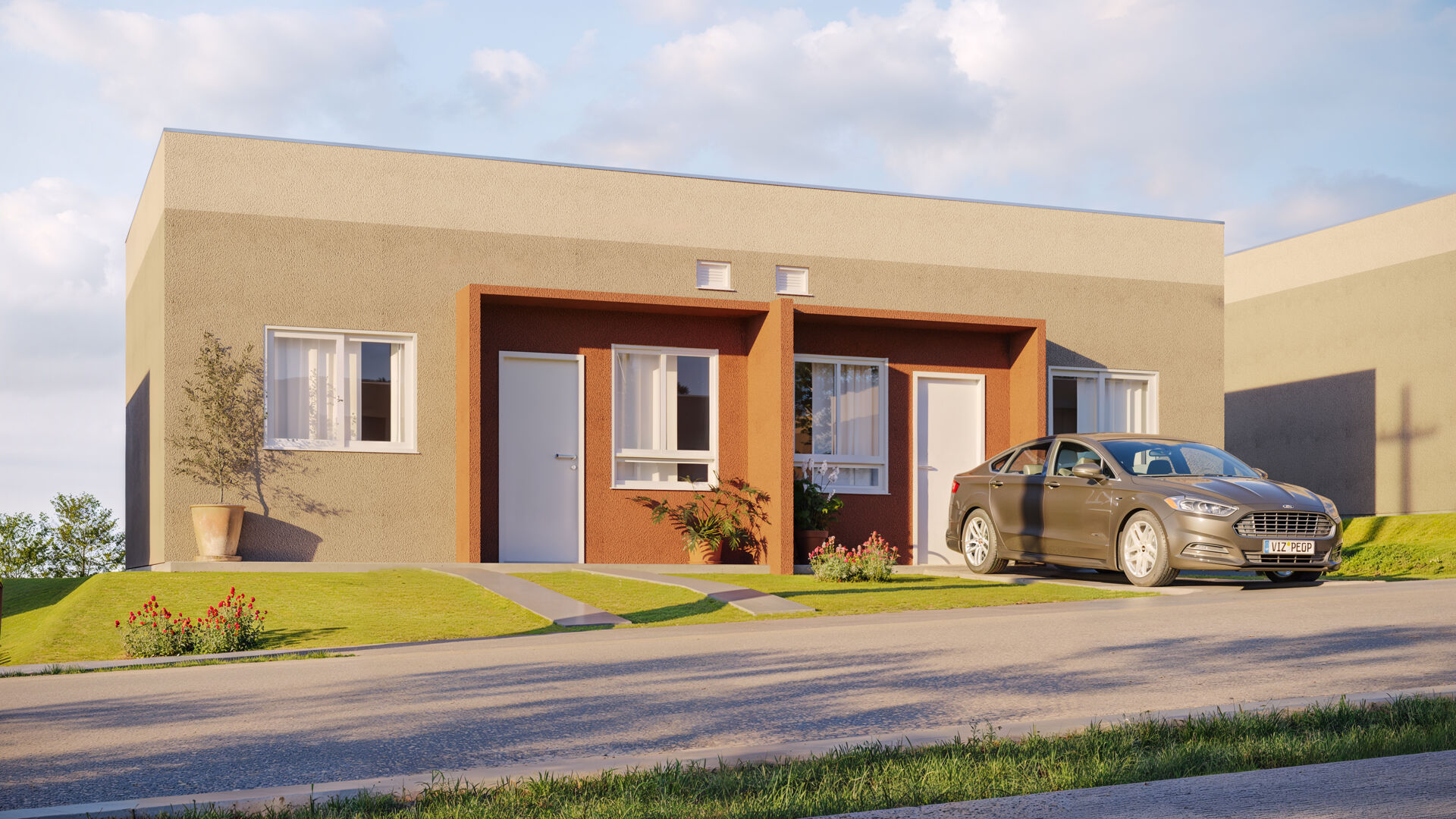 40,98m² - 2 quartos, sala, cozinha, banheiro, área de serviço e vaga para carros.