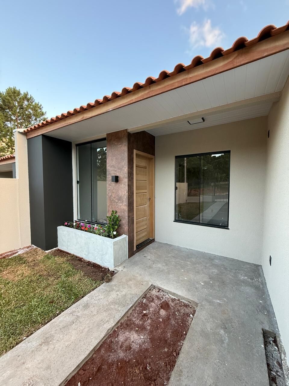 - Fachada moderna com janelas amplas, revestimento e arandela, floreira e jardinagem de bom gosto