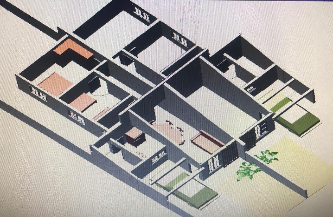 53m² - 2 quartos, sala, cozinha, banheiro, área de serviço e vaga para carros.