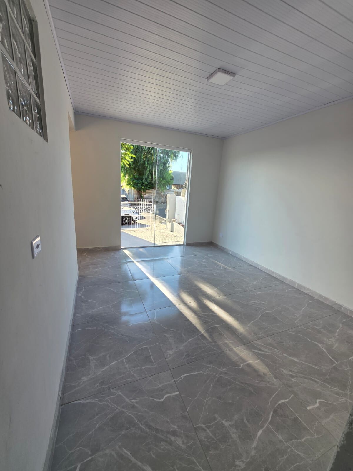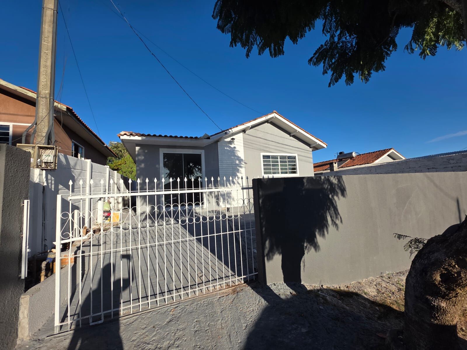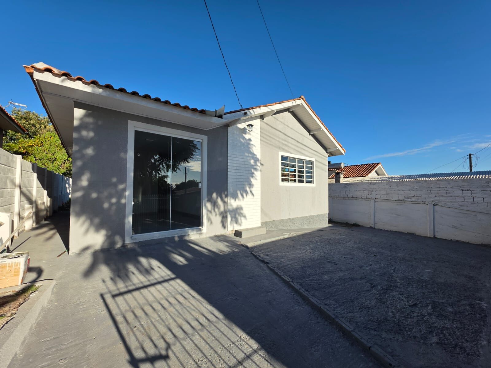 68m² - 3 quartos, sala, cozinha e sala de jantar, banheiro, área de serviço coberta, vaga para carros e grande sobra de terreno.