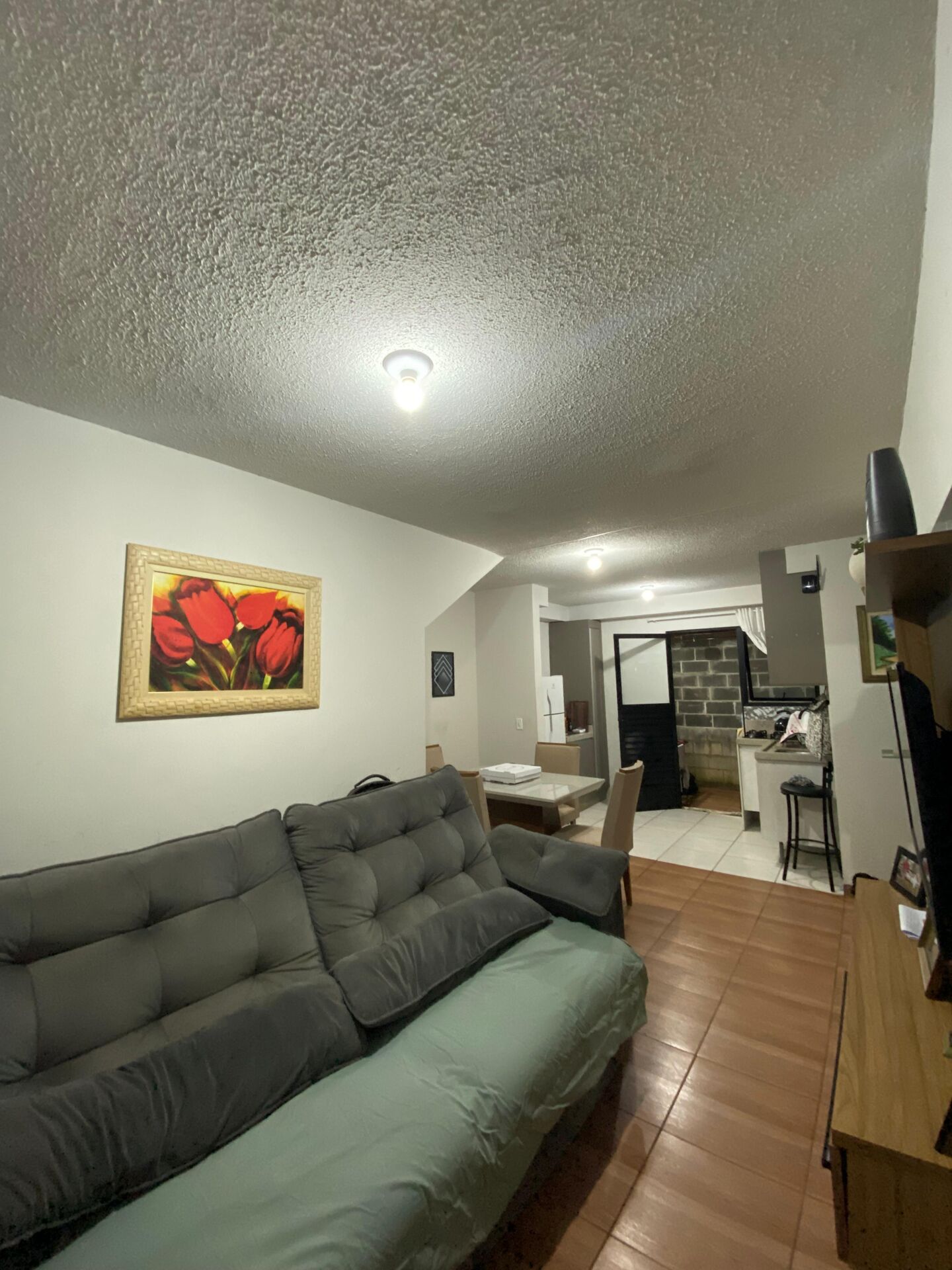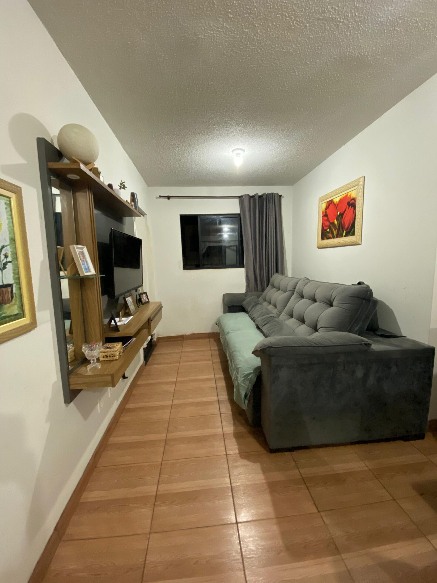 50m² - Sendo 2 quartos, sala de estar e jantar, cozinha, banheiro social, área de serviço e vaga para carro.